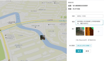 排污口的位置清晰可见,还可以在右侧查看该排污口的描述信息,和图片信息,点击图片可以放大浏览。