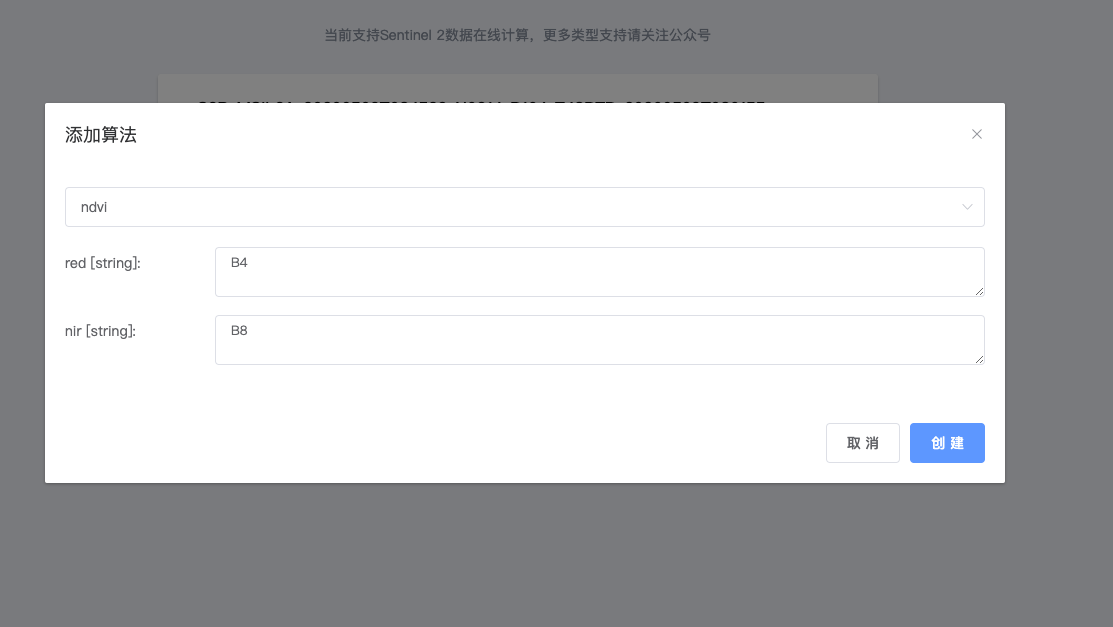 你还需要输入算法所需的参数,这里以ndvi为例,由于使用的是哨兵2 L2A级的数据,红波段为B4,近红外波段为B8。