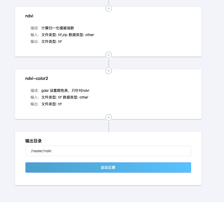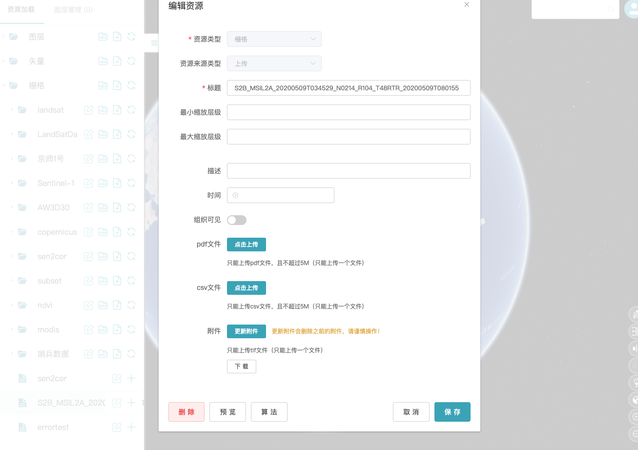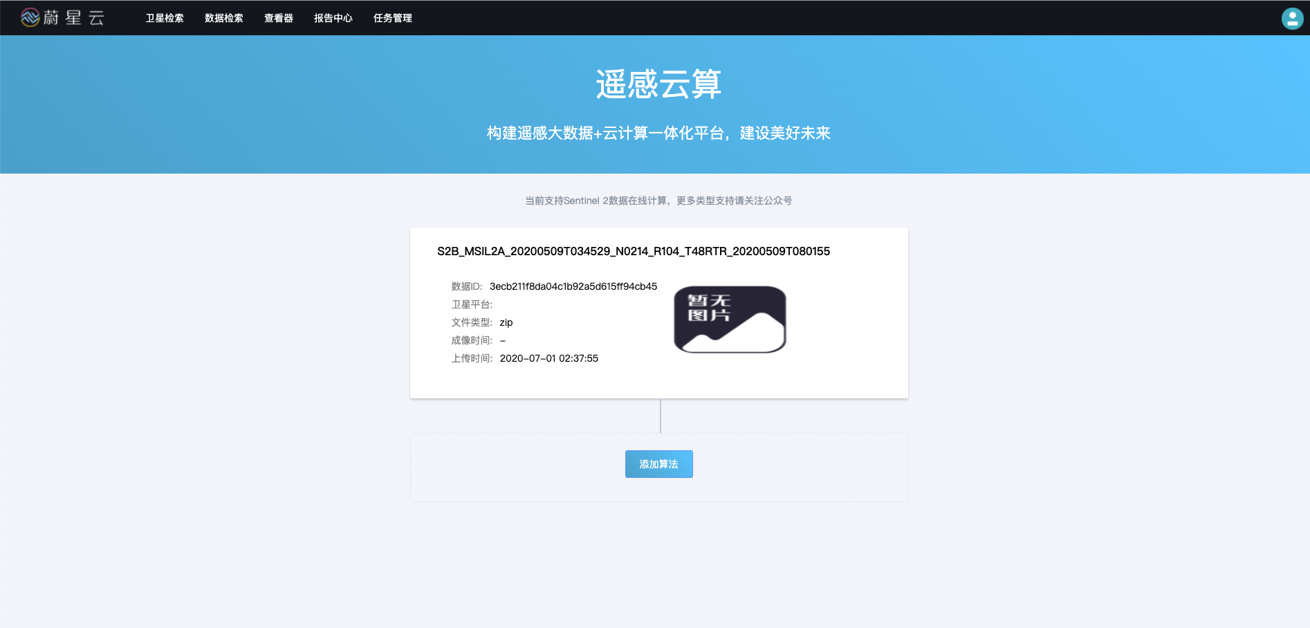 若数据从未被采集,需要点击采集按钮将数据采集到我们的服务器上,待数据采集完成,然后点击云算进入到任务创建的页面。进入到查看器https://portal.vsat.cloud/workshop ,点击图层管理 > 资源加载 在[栅格]或者[图层]文件夹选择一个tif数据,依次点击 编辑 > 算法