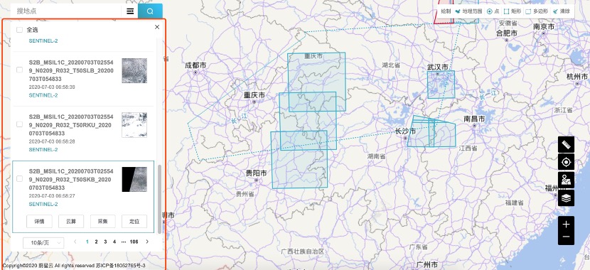 在使用检索功能时,可以在左侧看到检索得到的遥感影像信息,在地中显示了遥感影像的具体位置和大小。
