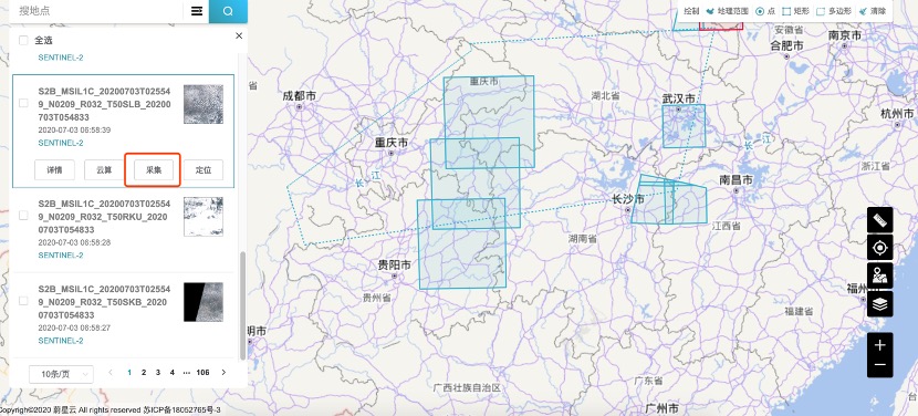 在结果页中通常会看到【采集】的按钮,点击该按钮,可以将该遥感影像原始文件从所属网站中采集到的本系统中。