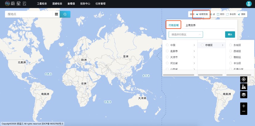 点击页面右上角【地理范围】按钮,选择【行政区域】标签,可以根据省市县结构,选择对应的行政区域范围,点击搜索按钮,匹配对应行政区域的遥感影像。